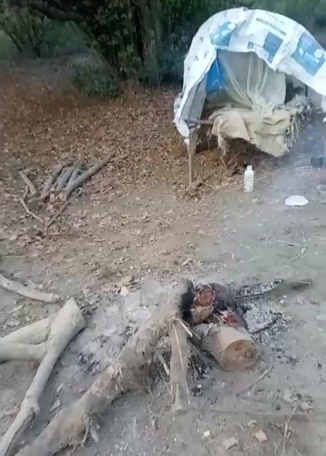 makeshift campsite in a wooded area