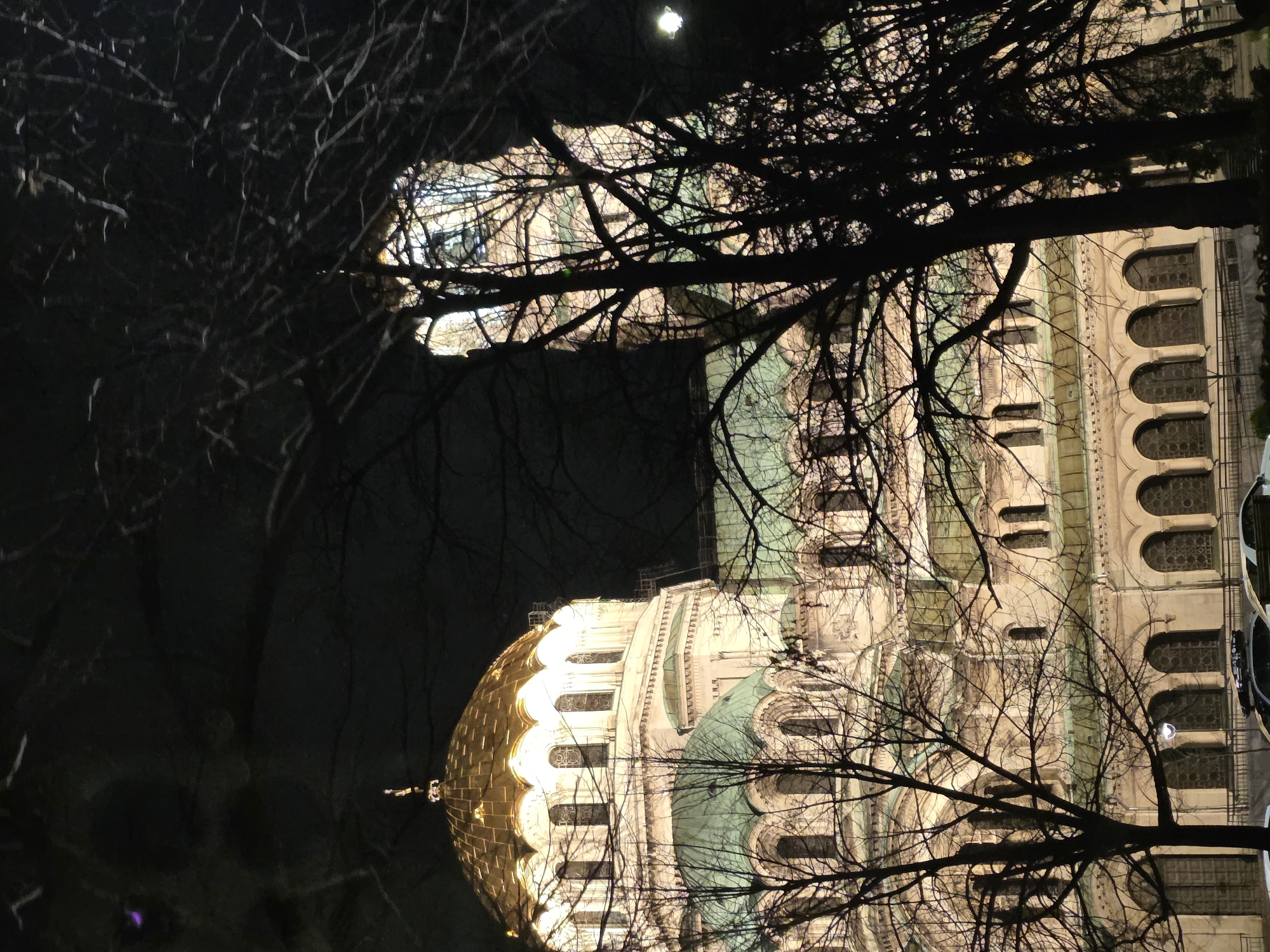 The image depicts the illuminated Alexander Nevsky Cathedral in Sofia, Bulgaria, at night. The cathedral is viewed through bare tree branches. A golden dome is visible on the left, with the facade of the building to the right. The moon is seen in the upper portion of the image. The background is dark.