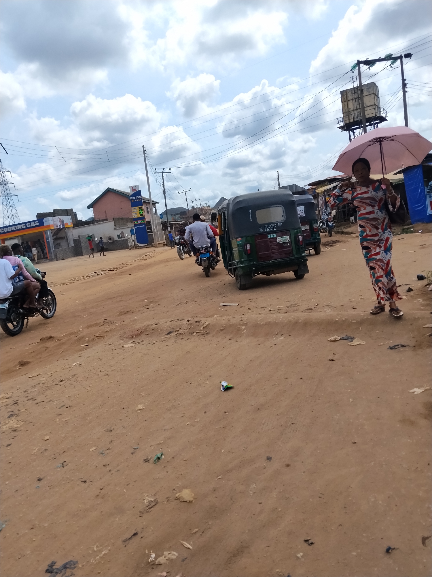street scene in Umuode, Nigeria. The road is unpaved, with dirt and debris scattered on the ground. Several vehicles are present, including motorcycles, and auto rickshaws. A woman is walking on the right side of the road, holding an umbrella. A gas station is visible in the background. Overhead power lines cross the scene. The sky is cloudy.