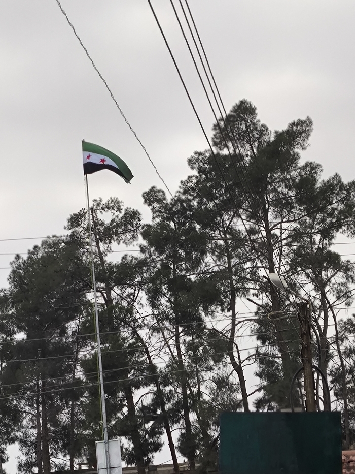 The image depicts an outdoor scene in Jirud, Syria, under an overcast, light grey sky. In the upper-left quadrant, a flag identified as that of the Syrian Opposition is flying from a metallic flagpole. The flag displays three horizontal stripes: green at the top, white in the middle, and black at the bottom, with two red five-pointed stars horizontally centered on the white stripe. Numerous dark green evergreen trees, appearing as conifers, occupy the midground and background, their foliage silhouetted against the sky. Several black utility cables crisscross the upper and middle sections of the frame. In the mid-right, a wooden utility pole is visible, supporting multiple cables and an attached grey metallic fixture. The lower-right corner partially reveals a dark green rectangular object, possibly a sign, and a section of a reddish-brown tiled roof. No individuals or specific actions are discernible within the frame.