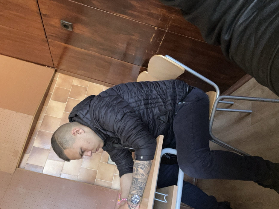An indoor scene in Kotel, Bulgaria, depicts a male individual seated at a light-colored wooden desk with metal legs. The male, positioned in the center-left, wears a dark, possibly black, hooded puffer jacket, black jeans, and a wristwatch on his left forearm, which also displays visible tattoos. His hair is short with faded sides and a distinct left-side part, and he is looking towards his left with a neutral expression. A small, colorful object rests on the desk near his left hand. The background features a tiled wall section of light brown squares below a plain lighter brown panel on the left. To the right, a darker brown, wood-paneled wall with vertical lines exhibits signs of wear and includes a visible electrical outlet. A second person, likely the photographer, is partially visible in the bottom right corner, indicated by a dark jacket or sleeve. The seating arrangement and environment suggest a classroom or similar institutional setting.