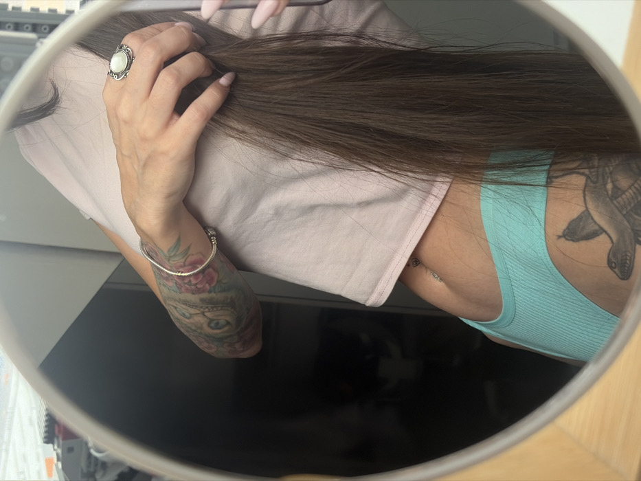The image is a mirror reflection depicting a portion of a female individual's upper torso, right arm, and upper right thigh, located in the city of Novosaratovka, Russia. The individual is wearing a light pink cropped t-shirt and aqua-colored ribbed underwear. Her long, straight, dark brown hair extends vertically along her right side. Her right hand, featuring light pink manicured fingernails, is positioned to lightly grasp her hair. The right arm is adorned with a full sleeve tattoo consisting of multiple floral patterns. A silver-toned bangle bracelet is visible on her right wrist, and a large silver-toned ring with an oval white stone is on her right ring finger. A belly button piercing with a small dangling charm is present on her exposed midriff. A tattoo depicting a coiled snake is visible on the upper right thigh. The background reflected in the mirror is dark and indistinct, suggesting an indoor environment.
