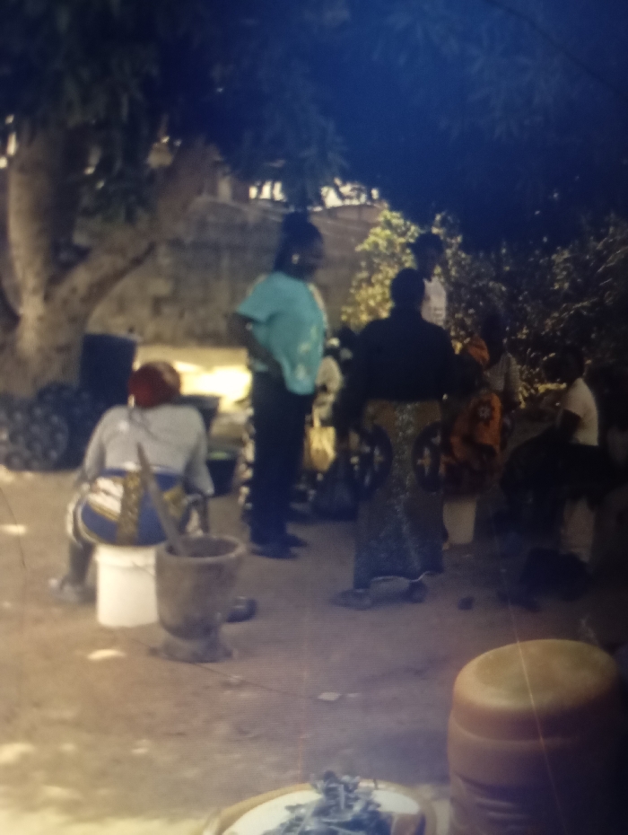 A group of people gather in a shaded outdoor area. One woman sits on a white bucket near a mortar and pestle. Another woman stands in a light blue shirt and black pants. Several other individuals are partially visible, their attire ranging from patterned skirts to a white shirt. A tray with green leaves is in the foreground. The setting appears to be a village or rural community, possibly during a preparation or gathering.
