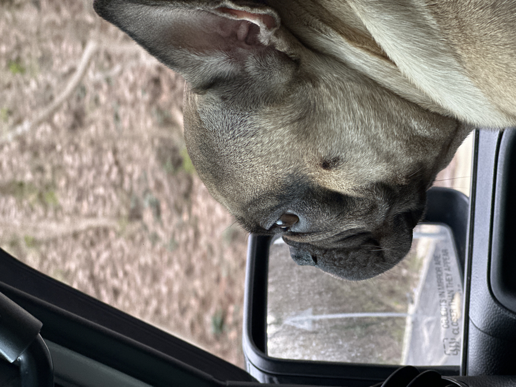 - "head of a fawn-colored French Bulldog dog positioned close to the side mirror of a vehicle" by FM-bmx3i1, licensed under CC BY 4.0