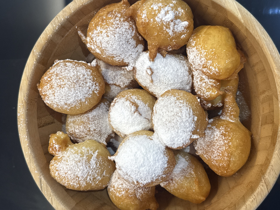 - "A close-up, top-down shot shows a wooden bowl filled with golden-brown, round fritters, liberally dusted with white powdered sugar" by FM-v1KIi2, licensed under CC BY 4.0