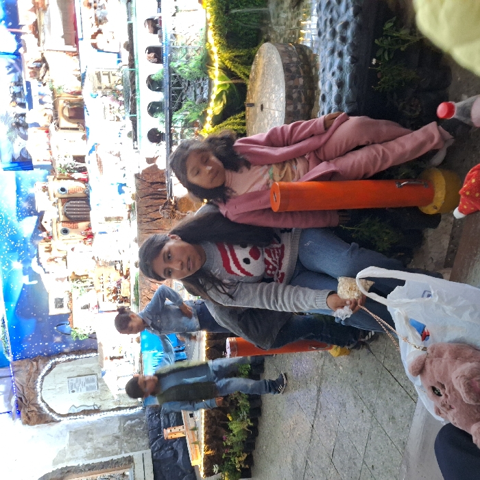 Two girls in casual attire pose on a playground feature. The elder girl wears a gray and red sweater with jeans, while the younger one is in a pink jacket and pants. Two figures in blue jeans and jackets appear to be seated further back. A large decorative display, possibly a cityscape with a starry sky, is visible in the background. Nearby, a stone wheel and other natural elements provide depth to the scene.