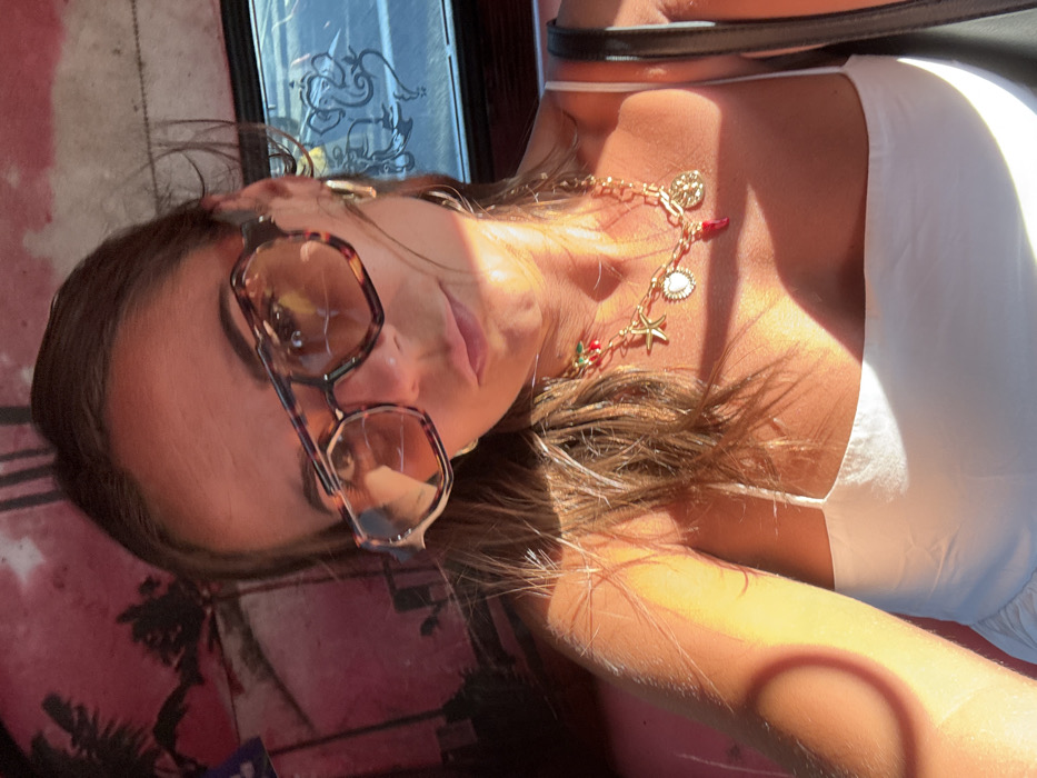 An adult female is depicted in a close-up, chest-up view, appearing to take a selfie within a vehicle. She has medium-brown hair, dark eyes visible through large, tortoise-shell framed sunglasses with amber lenses, and a neutral facial expression. She wears a white spaghetti-strap top, gold hoop earrings, and multiple gold-toned necklaces featuring various charms including a starfish, a heart locket, a circular medallion, and a red chili pepper or horn pendant, along with another necklace adorned with small red berry-like elements. Strong sunlight illuminates her right side and chest, creating distinct highlights and shadows. The immediate background to her left is a reddish-pink panel or upholstery patterned with dark silhouettes resembling palm trees. To her right, a vehicle window displays a clear outline of the Hindu deity Ganesha, either as a decal on the glass or part of the external vehicle design. The visible elements, including the Ganesha decal and tropical-themed interior, indicate the scene is likely within a local mode of transport in Galle, Sri Lanka. A black strap, possibly from a bag, is visible over her right shoulder.