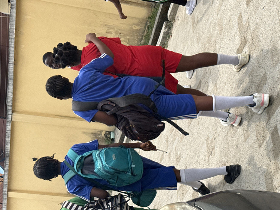 The image depicts a group of at least five young individuals walking on a paved pathway in Ado, Nigeria, adjacent to a light yellow/tan building wall