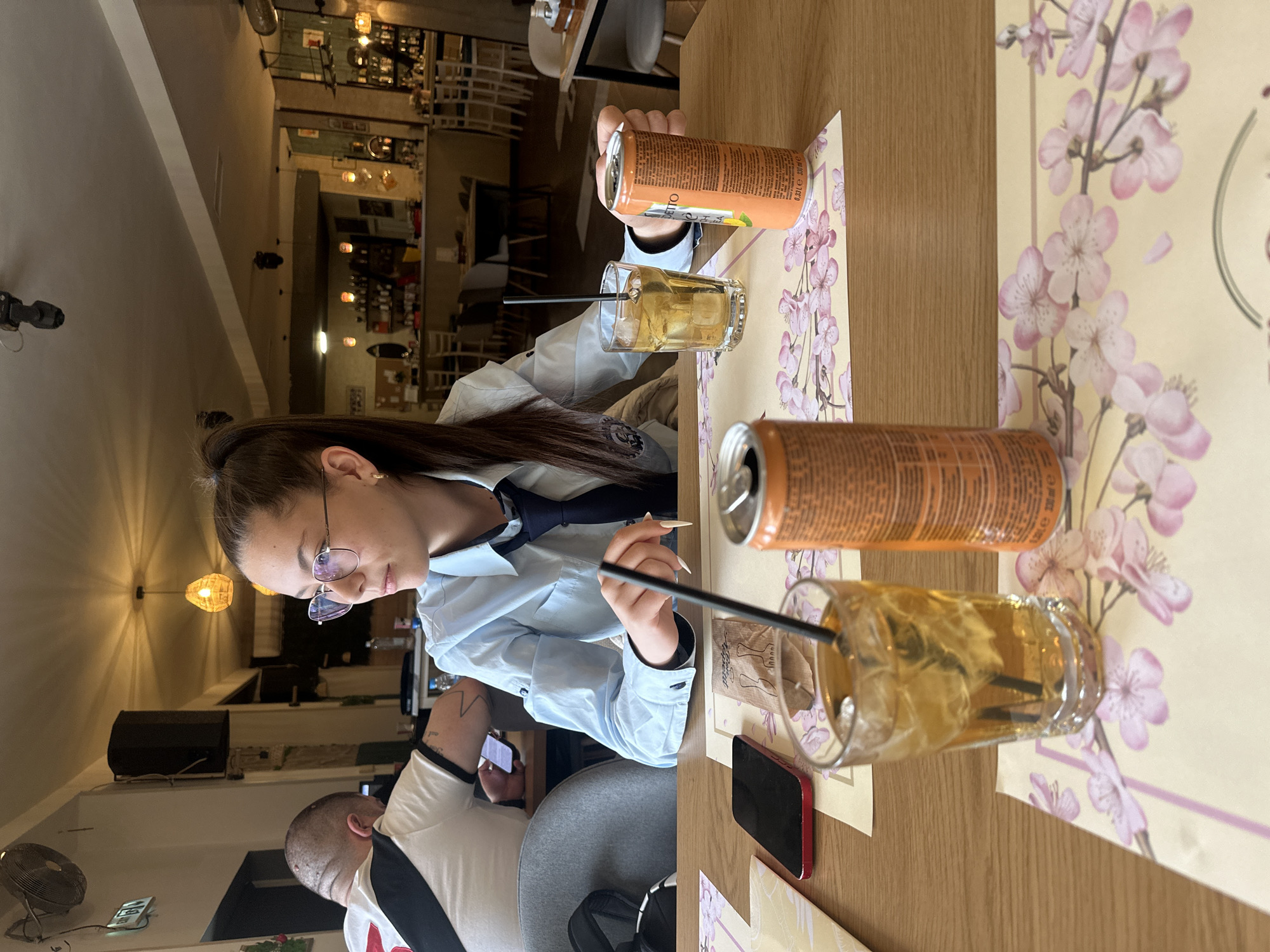 The image depicts an indoor scene within a cafe or restaurant located in Lukovit, Bulgaria. In the foreground, a light-colored wooden table is set with two placemats featuring a pink cherry blossom design. On the table, from left to right, are a red smartphone with a black screen placed face down, a small brown paper packet, a tall glass containing an amber liquid with ice and a black straw, and an orange aluminum beverage can. Another identical orange can is visible further to the left. Seated at the table on the right side of the frame is a young adult female, facing towards the right and looking off-camera. She has dark brown hair pulled back in a high ponytail, wears round metal-rimmed eyeglasses, and a small gold hoop earring in her right ear. Her attire consists of a light blue collared shirt with rolled sleeves and a dark blue tie, bearing an embroidered emblem on the right chest area. Her left hand rests on the table near the glass with the straw, and her right hand holds one of the orange beverage cans. She has long, pointed, light-colored fingernails. The cans are labeled "VEDDETTO PEACH TEA" and indicate a volume of 0.33L. In the mid-ground, to the left and behind the woman, an adult male is partially visible from the back and left side. He has a shaved head, displaying visible scalp imperfections, and is wearing a white t-shirt with a thick black diagonal stripe. A tattoo is partially visible on his right arm. He is seated at a separate table, looking down at a smartphone he holds. The background reveals the interior of the establishment, characterized by light-colored walls and a wooden ceiling. A dark-colored speaker is mounted on the wall to the left, with an oscillating fan positioned above it and a digital display below. Further back, a bar area is visible, stocked with bottles and glasses on shelves, fronted by several white bar stools. Various decorative light fixtures, including rattan pendant lights and industrial-style track lighting, illuminate the space. Additional tables and chairs are scattered throughout the background. A small black security camera is mounted on the ceiling.