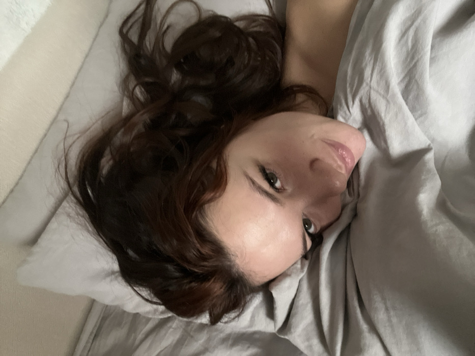 The image depicts a single female individual positioned on a bed in an indoor domestic environment. The specific location within Mytishchi, Russia, cannot be determined from the visual information provided. The individual, a female with fair skin and dark brown, wavy hair, is lying on her left side with her head resting on a light grey pillow. Her hair is spread around her head on the pillow and the bedding. Her gaze is directed towards the camera, and she exhibits a slight smile with glossy lips. Her eyes appear light-colored, possibly green or hazel, and she has prominent eyelashes. She is partially covered by light grey bedding, likely a duvet or sheet, which conceals her lower body and most of her torso. Her right bare shoulder is visible in the upper right quadrant of the frame. The background consists of a plain, light-colored wall in the upper left corner. The lighting is soft and even, suggesting an indoor setting. No other individuals or significant objects are visible in the frame.