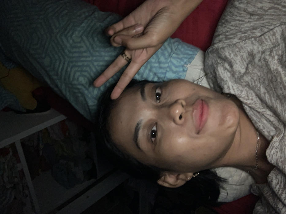 An adult female is depicted in a close-up, dimly lit, indoor setting. She has dark hair, a tan complexion, and is looking directly at the camera with a slight smile. She wears small earrings, a thin silver-colored necklace, and a light-colored, patterned top. Her right hand is raised, performing a peace sign (V-sign) with the index and middle fingers extended; a dark ring is present on her ring finger. She appears to be reclining on a patterned blue-green pillow, with a solid red fabric visible behind her right shoulder. To her upper left, a dark shelf or storage unit contains indistinct items. The specific location within Kecamatan Pati, Indonesia, cannot be determined from the visual information provided.