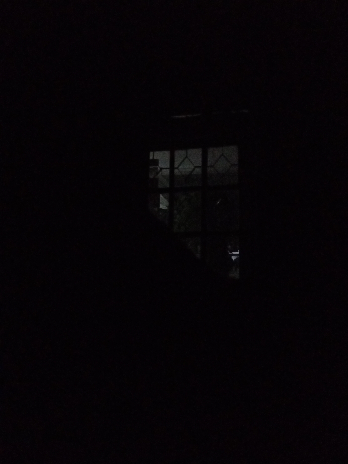 The image displays an interior view at night or in low light conditions, focusing on a window situated on the right side of the frame. The majority of the scene, comprising the left two-thirds, is completely dark. The window features a dark frame and a grid pattern, with the upper sections exhibiting a geometric or diamond-shaped grille, and the lower sections a simpler rectangular pane division. Through the window, faint light reveals indistinct exterior elements, possibly dark foliage or trees. A small, vertically oriented reflective object or light source is visible in the lower right pane of the window. There are no individuals, explicit actions, or interactions depicted. This scene is located in Qorday, Kazakhstan.