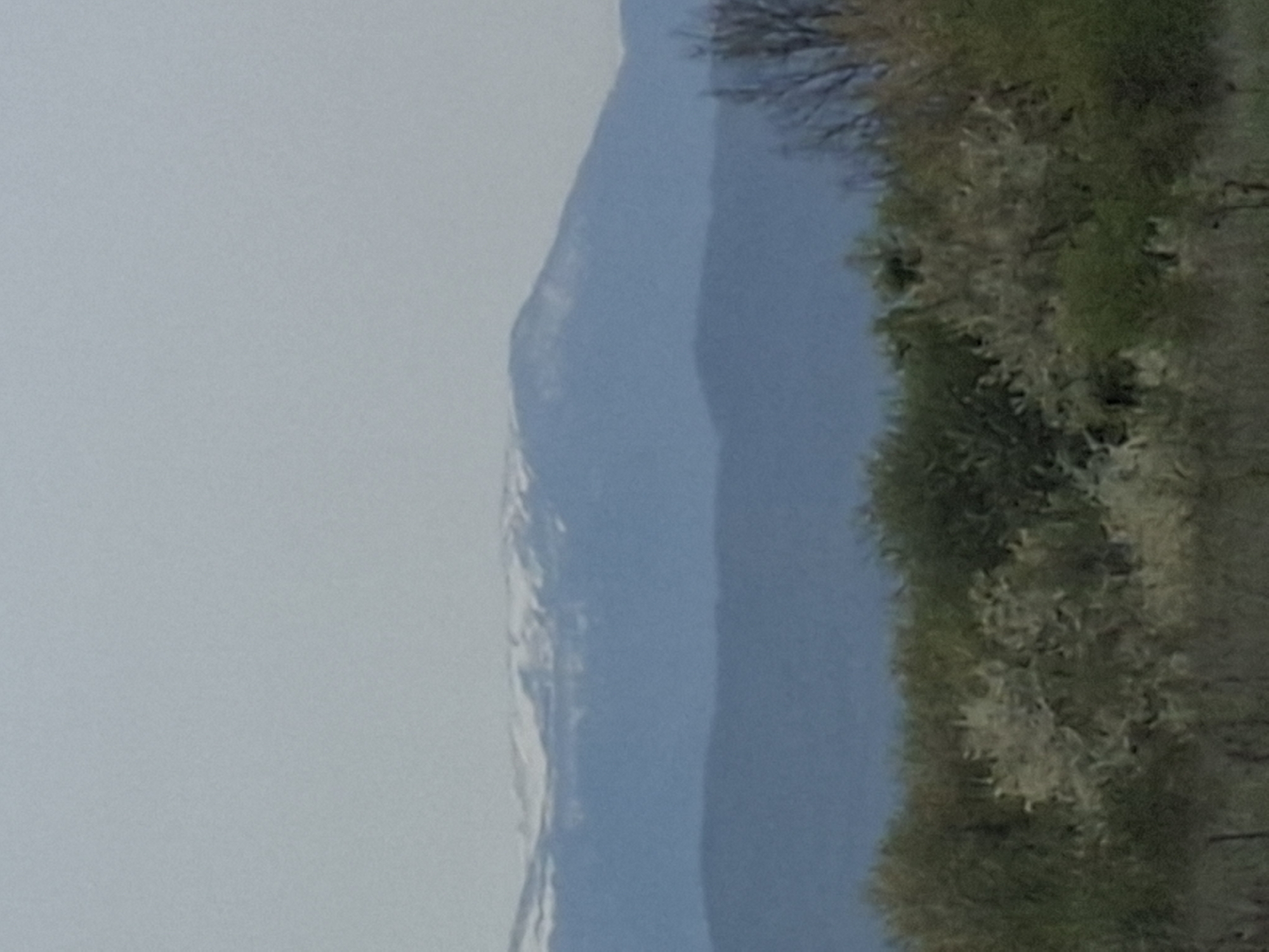 The image depicts a mountain range with snow on the peaks, adjacent to a tree line with varying shades of green. The sky is overcast and light gray. The image appears to be oriented vertically. There is no discernible information to suggest it is related to Blagovo, Bulgaria.
