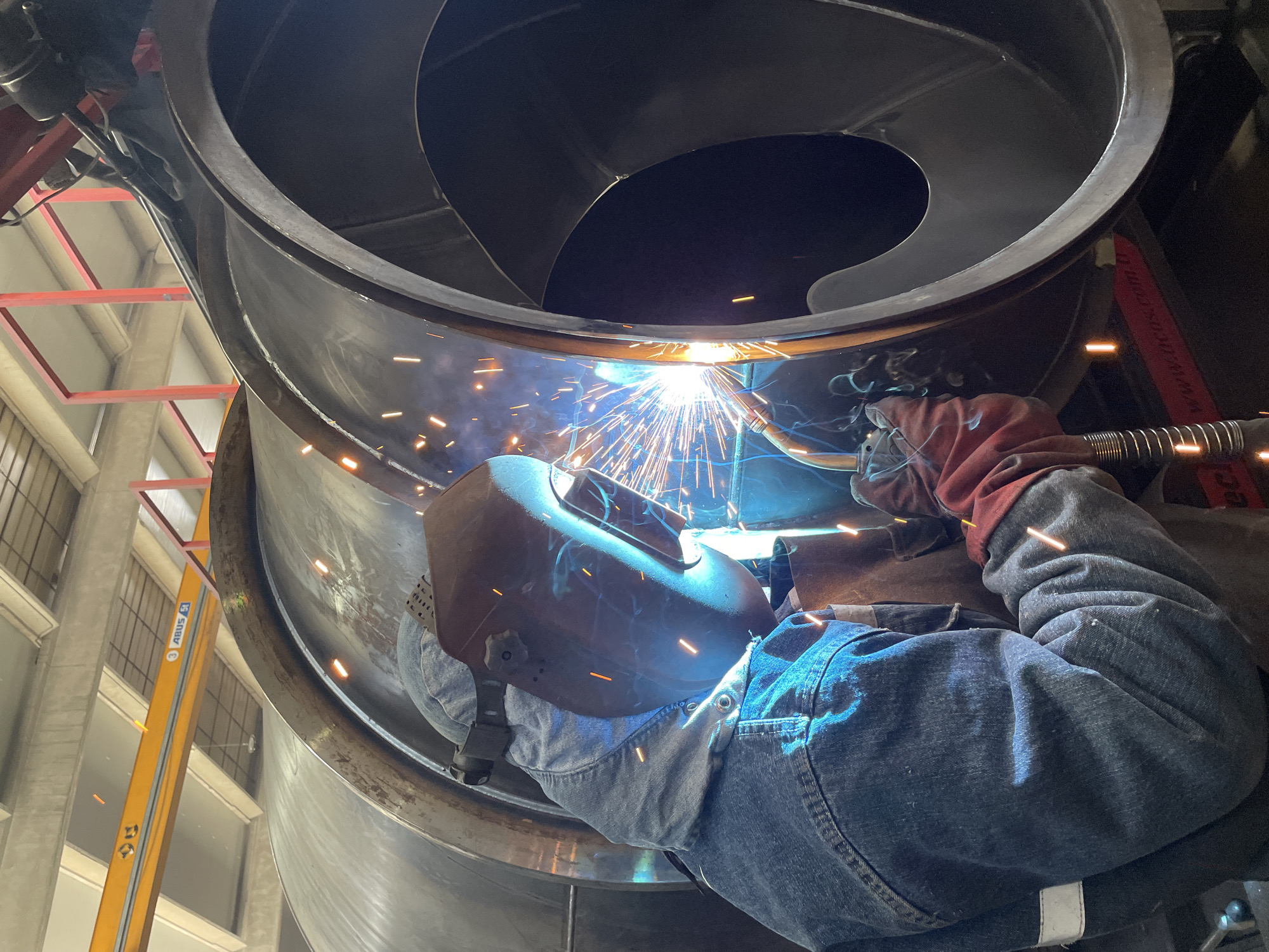 A single individual, positioned in profile, is actively engaged in arc welding a seam on a large, dark metal cylindrical structure