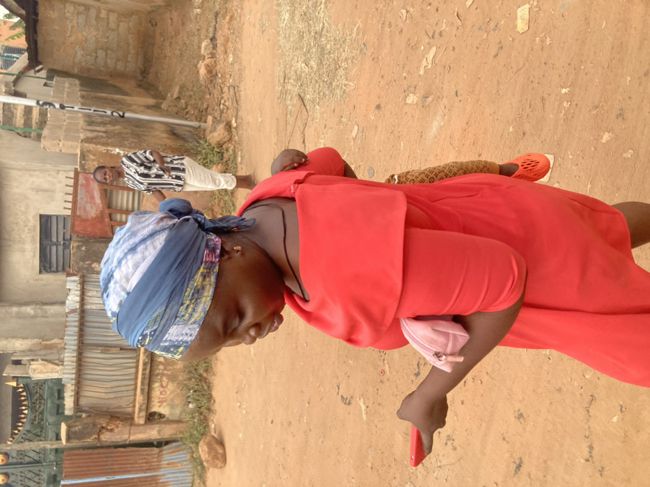 This image depicts a daytime street scene in Agege, Nigeria. In the foreground, a woman is positioned slightly off-center to the left, facing right and looking down at a red smartphone held in her left hand. She wears a blue and white patterned headscarf, a red off-shoulder dress, a thin black necklace, and a gold stud earring in her visible left ear. A small, light-pink zippered pouch is tucked under her left arm. A child, whose lower legs and feet are visible on her right side, is strapped to her back, wearing orange perforated shoes and a patterned fabric wrap. In the mid-ground, a second woman stands further back and to the right, wearing a black and white patterned short-sleeve top and light-colored three-quarter length trousers. She appears to be looking towards the left of the frame. The environment consists of an unpaved, reddish-brown dirt ground with sparse dry vegetation. The background features various structures: on the far left, a rusty corrugated metal fence abuts a stone pillar. To its right, a green metal gate with decorative elements is visible. Behind the foreground woman, a light-colored building with a dark window is present. Further to the right in the mid-ground, another light-colored building features visible steps and a utility pole or marker inscribed "ST112". A roundish brown rock rests on the ground near the rusty fence on the left. The scene is illuminated by ambient daylight.