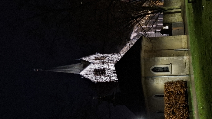 A church stands illuminated against a dark sky, its spire reaching upward