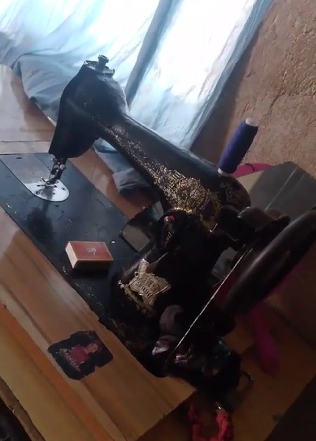 The camera is positioned at a high angle, tilted slightly, capturing a static shot of an antique, black sewing machine. The machine sits on a wooden table, with a blue spool of thread attached to its side. A small box of matches rests on the table's surface near the machine's base, and a sticker featuring a woman is adhered to the table's corner. A pale blue curtain hangs in the background, creating soft lighting in the room. The sewing machine's ornate, gold detailing is visible, contrasting with its dark, worn appearance.