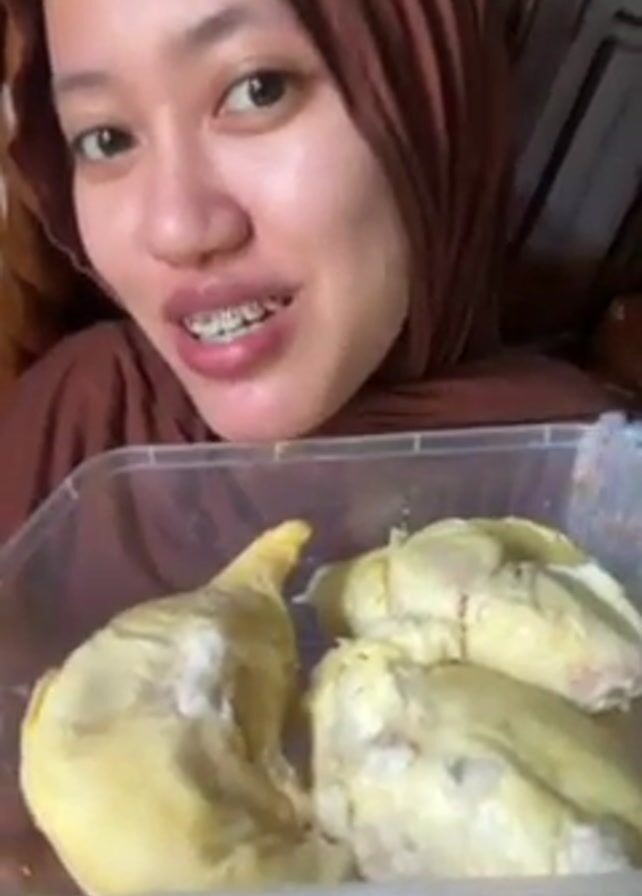 young woman with fair skin, wearing a brown hijab and braces, holding a clear plastic container filled with durian fruit
