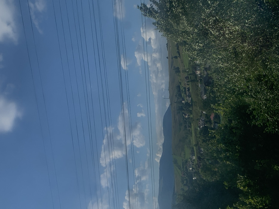 The image displays a panoramic view of a rural mountainous landscape in Yasinia, Ukraine, under a clear blue sky populated with scattered white cumulus clouds. Multiple dark, thin horizontal wires, consistent with utility lines, traverse the upper portion of the frame, partially overlaying the sky and distant hills. The immediate foreground is dominated by dense, dark green foliage from trees and bushes, which partially obscures the lower midground. The midground reveals a settlement or village nestled within a valley and across rolling green hills. This area contains numerous residential structures with dark roofs, interspersed with smaller trees and patches of green grass. Further into the midground, the hills rise, covered in green vegetation, with some lighter patches indicating open ground. In the background, larger, darker mountains with varied terrain are visible, their peaks partially obscured by the sky or distant haze. On a prominent hill in the mid-distance to the right, two slender, dark vertical structures, consistent with communication towers or electrical transmission pylons, are present. A large, light-colored, dome-shaped or building structure is also visible on a more central distant hill. No human figures, animals, or vehicles are discernible in the scene.