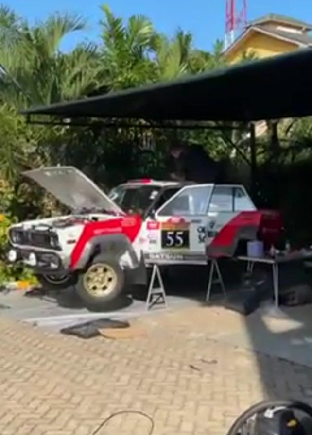 vintage rally car under a canopy in an outdoor setting. The car is predominantly white with red accents, and it has the number "55" prominently displayed on its side. The hood is open, revealing the engine compartment. The car is raised on jack stands, indicating ongoing maintenance or repair work. A man is working on the roof of the car, and another person is standing nearby observing. Several items, including tools and containers, are arranged on a table beside the car. A vacuum cleaner and some other equipment are visible in the foreground. The backdrop includes lush greenery, a clear blue sky, and a tall communication tower in the distance. The area beneath the canopy is paved, suggesting a patio or parking area.