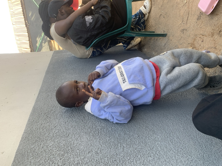 A child in a blue sweatshirt and gray pants lies on a textured gray surface, giving a peace sign with his fingers. Behind him, two adults sit on a green chair. The person on the chair's back wears a white tank top, while the person on their lap wears a black jacket and baseball cap. The surface is part of a concrete exterior.