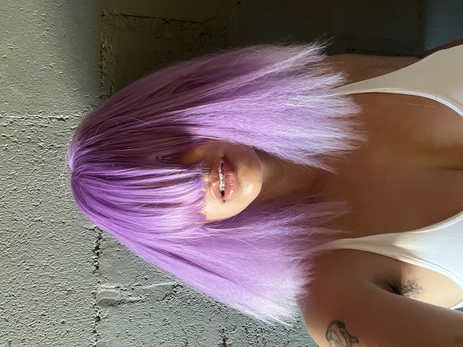 The image presents a close-up, chest-up portrait of an individual, likely female, situated in Arraial Do Cabo, Brazil. The subject is characterized by voluminous, bright purple hair with full bangs that completely obscure the eyes and upper facial features. The hair transitions subtly to a lighter lilac or white at the ends. The visible lower face displays full, glossy lips, slightly parted to reveal upper teeth fitted with dental braces. The individual wears a white tank top, with a thin strap visible over the right shoulder. Dark, visible hair is present in the right armpit region. A small, dark-outlined tattoo, appearing abstract or avian, is visible on the upper right arm/shoulder. The background is a textured, grey concrete or cinder block wall, with lighting suggesting illumination from the viewer's left, creating a darker area on the right side of the background.