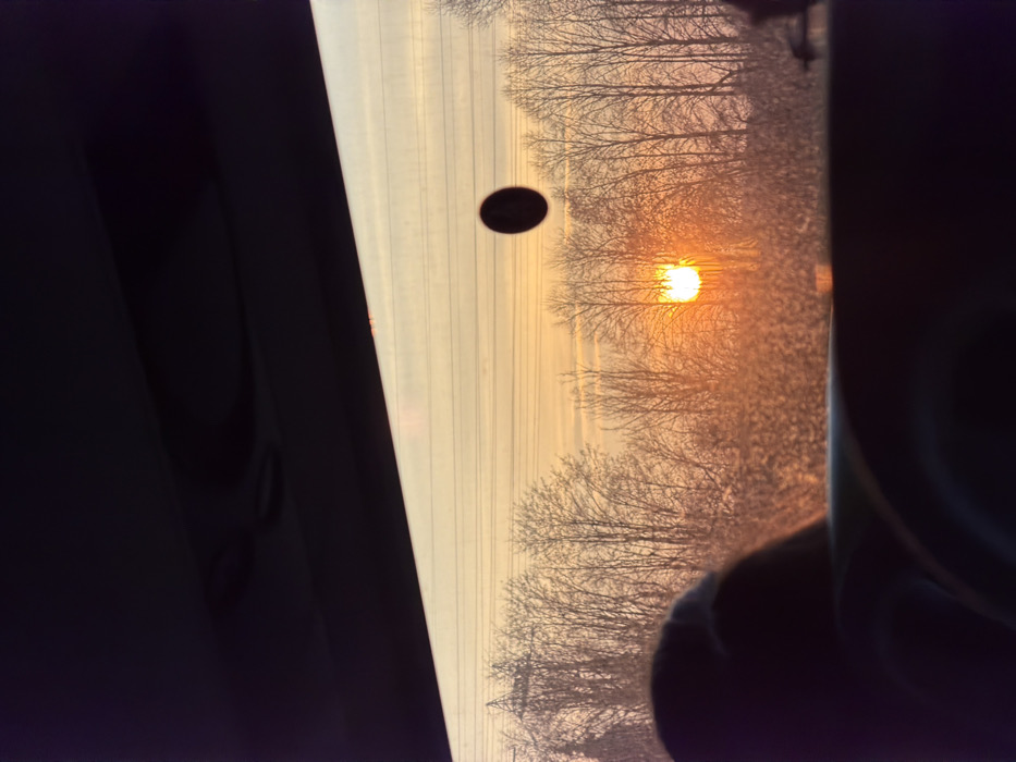 The image depicts an exterior landscape viewed from the interior of a vehicle in Brumath, France. The scene captures either sunrise or sunset, with a bright, orange-yellow sun partially visible through a dense line of bare deciduous trees along the horizon. The sky is a gradient of pale orange and light blue, traversed by multiple thin, parallel power lines. Evidence of power pylons is present on the far left. The upper and lower portions of the frame are occupied by the dark, obscured interior structures of the vehicle, consistent with a headliner and dashboard/steering wheel. A dark, circular object, approximately 4-5 cm in diameter, is suspended or affixed to the windshield in the upper central area. The overall atmosphere is hazy or misty, possibly exacerbated by condensation or frost on the windshield, diffusing the light. No individuals or specific actions are discernible.