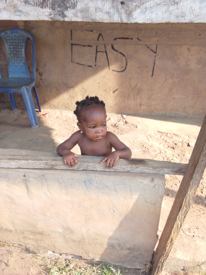 A young child with dark skin and short, dark hair stands behind a waist-high cement structure with a wooden top. The child is bare-chested and wears small hoop earrings. In the background, a wall has "EASY" written on it in large, black letters. To the left, a blue plastic chair sits against the wall. A wooden post is visible to the right, near the corner of the cement structure. The ground appears sandy.