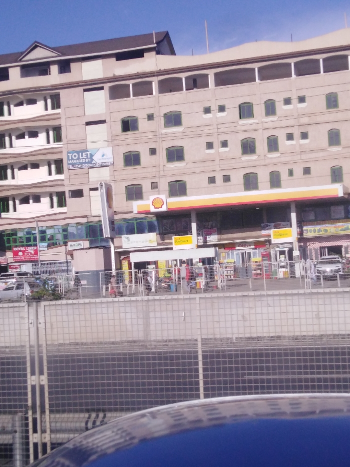 A multi-story building stands next to a Shell gas station. A "To Let" sign is visible on the building. A fence runs along the bottom of the frame, with the hood of a car visible in the foreground. People can be seen near the gas pumps. The scene appears to be taken from across a street.