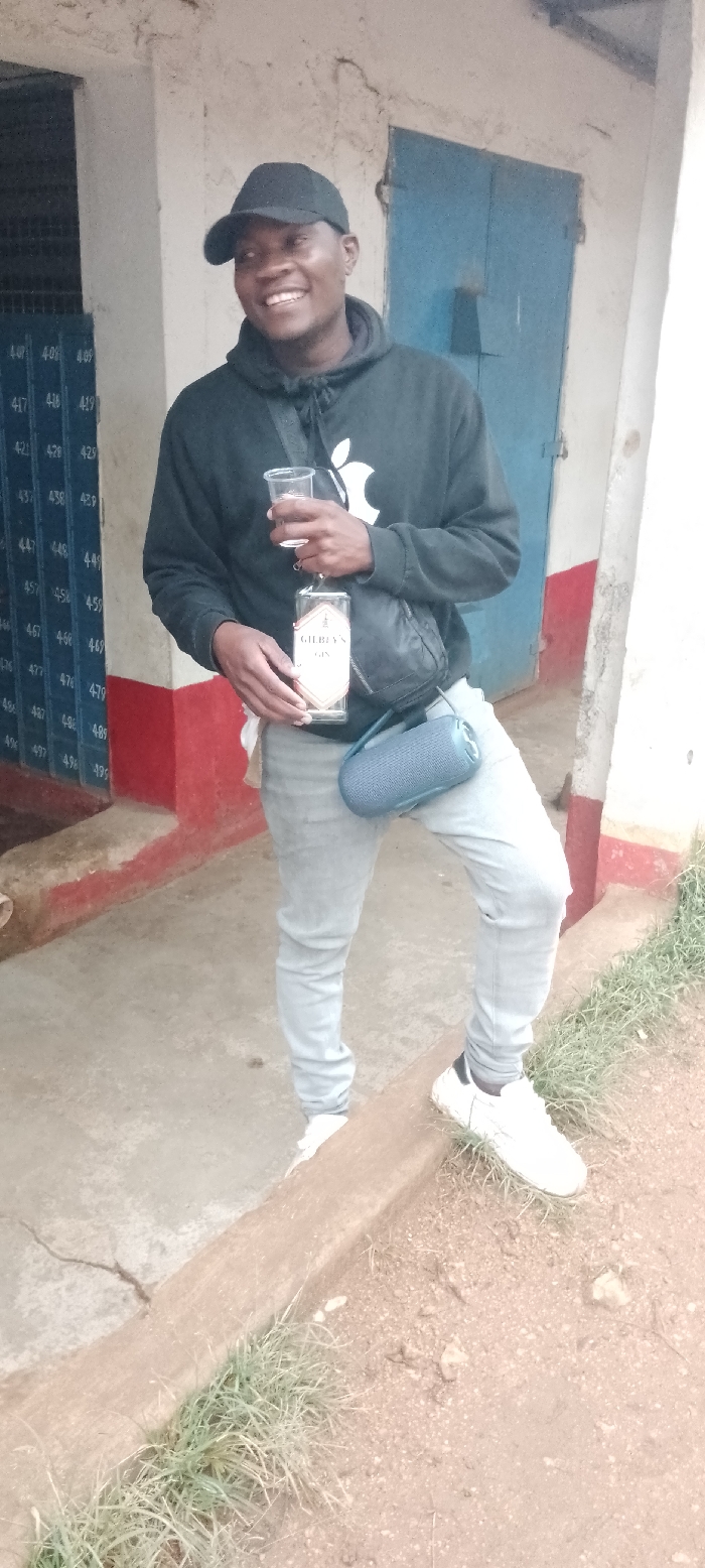 An outdoor, full-body shot depicts an adult male standing in Mahiakalo ward, Kenya. The subject, exhibiting dark skin, wears a black baseball cap, a black hooded sweatshirt with a white Apple logo on the chest, light-wash jeans, and white athletic shoes with black heel accents. He smiles broadly, looking towards the viewer's right. His right hand holds a clear plastic cup, and his left hand grips a transparent glass bottle labeled "GILBEY'S GIN." A black sling bag is positioned across his chest, and a blue cylindrical Bluetooth speaker is suspended from his left hip. The subject's left foot rests on a concrete curb, while his right foot is on a concrete paved area. Behind him, a worn, light-colored building wall is visible. To his left, a section of the wall features multiple blue compartments, numbered sequentially from 407 to 499, above a red base. To his right, a weathered blue wooden door with visible hardware is present. The ground transitions from a concrete pavement to a dirt patch with sparse green vegetation, separated by a concrete curb.