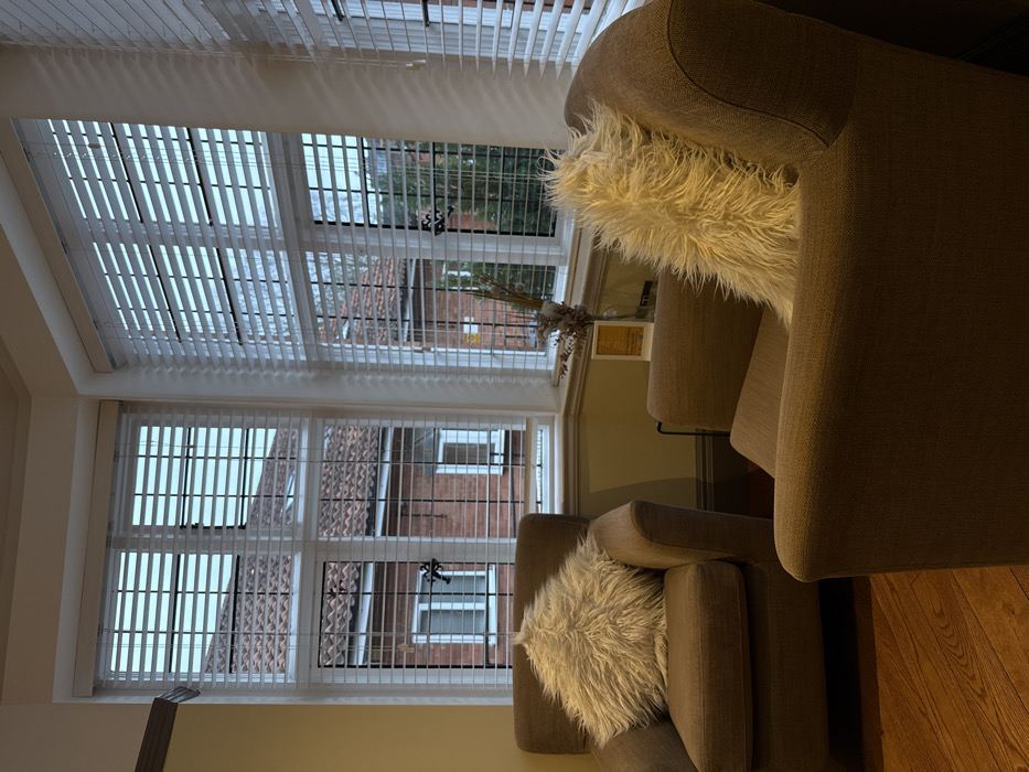 This image displays the interior of a room within a residential property in York, United Kingdom. A bay window occupies the background, featuring multiple sections fitted with white Venetian blinds. The blinds are partially open, allowing light to enter and revealing brick residential buildings with red-tiled roofs and white-framed windows, as well as some distant green foliage outside. Two upholstered armchairs, in a neutral brownish-grey fabric, are positioned on a polished wooden floor. Each armchair contains a fluffy, cream-colored faux fur cushion. A small, dark-framed side table stands between the chairs, holding a clear glass vase containing dried botanicals and a small, framed informational card or picture. Sunlight casts distinct linear patterns from the blinds onto the chairs and floor. No individuals are present.