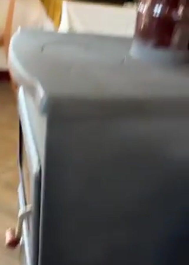 The video starts with a close-up of a dark-colored wood-burning stove standing on a tiled floor