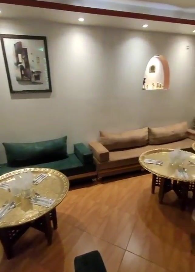 interior of a room designed to mimic a traditional Moroccan setting. The room has low seating arrangements comprised of plush cushions and sofas in various neutral tones, and intricately carved round tables made of what appears to be brass. The floor is covered with wooden tiles arranged in a geometric pattern. Several ornate hanging lamps provide ambient lighting, and decorative sconces are mounted on the walls. Niches in the walls display small ornaments. Artwork adorns the walls, and curtains with decorative trim cover the windows. The overall impression is of a cozy, private dining or lounge area, likely within a restaurant or hotel.