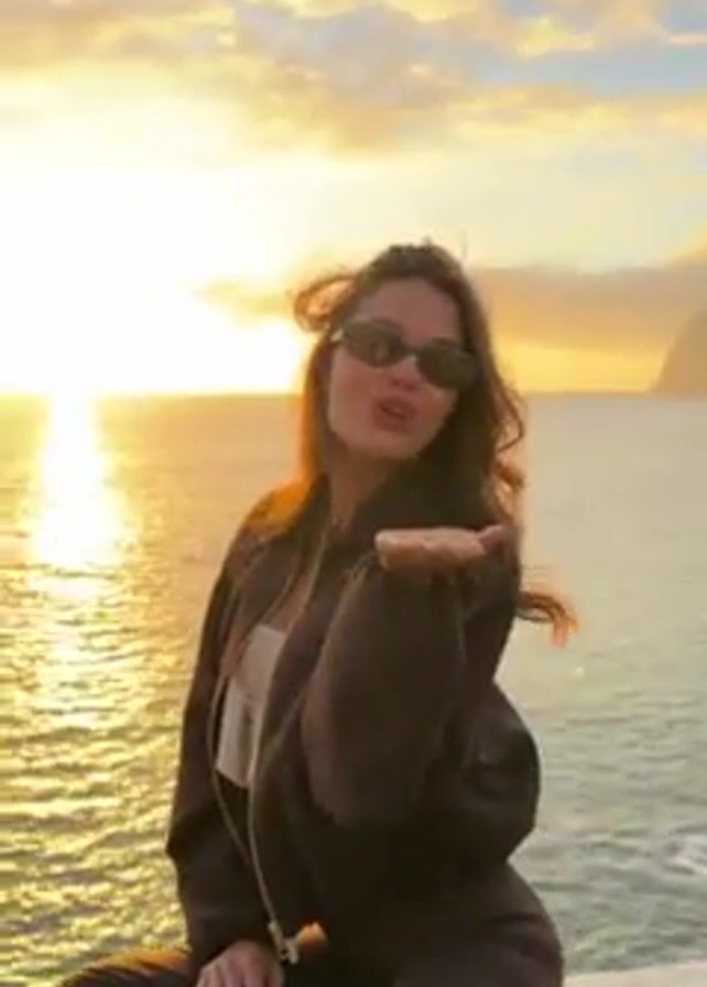 A woman with long, dark hair and sunglasses sits on a ledge overlooking the ocean at sunset. She wears a dark-colored tracksuit and a light top underneath. She blows a kiss towards the camera, then turns and looks out at the water. The sun is setting over the ocean, and the sky is filled with orange, yellow, and blue clouds. There are some rocks in the water near the ledge. In the distance, a coastline with mountains can be seen.