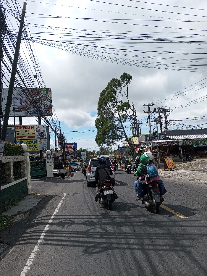 The image depicts a daytime street scene in Taohom, Laos, under a partly cloudy sky. The asphalt road occupies the lower portion of the frame, with a solid white line marking its left edge and a dashed yellow line indicating a lane division further right. Traffic consists primarily of motorcycles and a silver minivan/SUV, all appearing to move away from the camera. In the immediate foreground, two dark-colored motorcycles are present. The left motorcycle has a single rider wearing a dark jacket and helmet, with a license plate "B 3912 PIG" partially visible. The right motorcycle carries two riders; the front rider wears a green helmet, dark jacket, and blue backpack, while the rear rider, dressed in a pink top and blue jeans, also carries a light blue backpack. On the left side of the road, a low brick wall and a green gate with a white sign post bearing the word "BUNGA" are visible. Directly behind this, a tall utility pole is laden with numerous black electrical and communication cables that extend horizontally across the sky. Below these wires, several billboards are mounted, including one with food imagery and a white sign displaying "DIMSUM" in red and "MIE AYAM EXPRESS" in yellow lettering. The right side of the road features a tall, slender tree with green foliage leaning towards the left. Behind this tree, a complex arrangement of utility poles and transformers is present. Low-rise commercial buildings with open storefronts and awnings line this side of the street, suggesting shops or food stalls. Further down the road, additional vehicles and structures are visible, contributing to a busy urban environment. Shadows of overhead wires and objects are cast upon the road surface.
