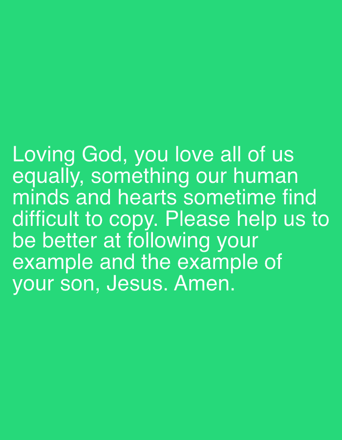 The image is a solid green background with white text. The text is a prayer. It addresses a "Loving God" and acknowledges God's equal love for all people. It recognizes that human minds and hearts struggle to replicate this unconditional love. The prayer requests help in better following the example of God and his son, Jesus. The prayer concludes with "Amen."