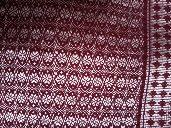 The image displays a close-up, static shot of a woven textile featuring a repeating pattern. The fabric is predominantly dark red (maroon) with intricate off-white or light gray patterns. The main section of the textile exhibits a grid of repeating floral motifs, each enclosed within an oval shape. These ovals and floral designs are rendered in off-white/light gray against the dark red background. To the right, a vertical border section is visible, separated from the main pattern by a thin dark red vertical stripe. This border features a pattern of repeating dark red diamond or rhombus shapes against a lighter, possibly off-white, background. The texture suggests a brocade or jacquard weave. No people, actions, or specific environmental details beyond the fabric itself are discernible. The precise location within Ganja City, Azerbaijan, cannot be determined from the content of this image.