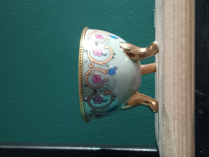 Location: Unknown, Unknown. A small, decorative, three-footed bowl is centrally positioned on a light-colored wooden surface. The bowl is light teal, featuring a gold-colored rim and three ornate, gold-colored stylized feet. Its exterior is adorned with intricate gold scrolling patterns, interspersed with pink five-petal flowers and blue bell-shaped flowers. The wooden surface exhibits visible grain and sparse dust particles. A solid dark teal wall forms the background. A dark, vertical structural element is partially visible on the far left. No individuals, actions, or interactions are depicted.