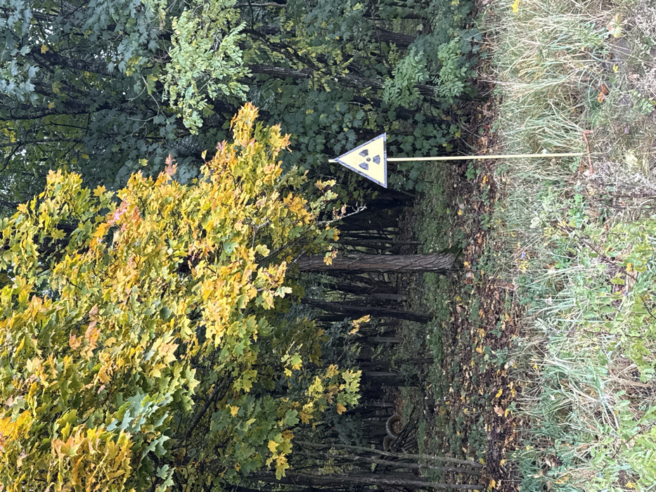 The image depicts a radiation warning sign positioned at the edge of a reforested area within the city of Pryp'yat', Ukraine