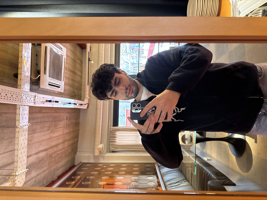 A person reflects in a mirror while holding a smartphone to take a picture. They wear a dark zip-up hoodie with a design on it and light-colored jeans. The reflection shows a mix of architectural elements: white cable trays, a gray wall, a window with buildings outside, a wooden patterned surface, and interior furniture. The frame of the mirror is a light brown wood.