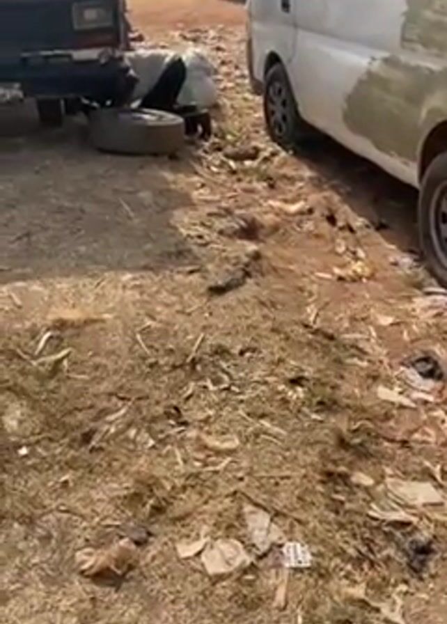 vehicle repair lot on a dry, trash strewn field. A person dressed in black pants and a light-colored shirt is working beneath the back of a black car that has no bumper. A tire lies next to them. To the right of this car is a white van that has been partially covered in primer. Other vehicles, mostly vans, can be seen in the background. The ground is dry and covered in dead grass and trash. An object that appears to be a square metal frame is on the left in the foreground. The video is a medium shot taken from a stationary position.