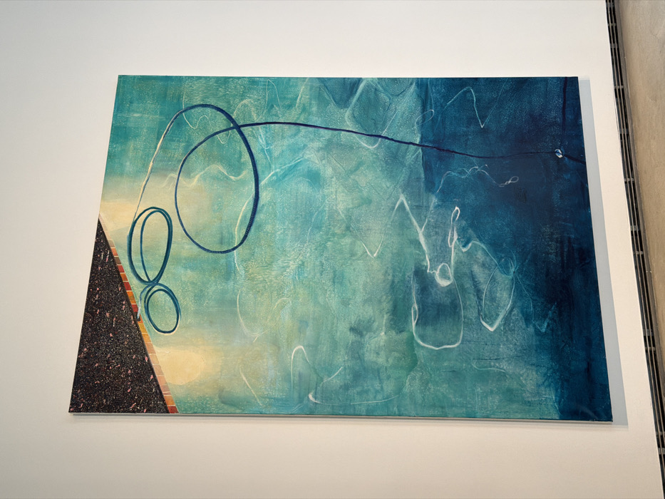 A large, vertical abstract painting is centrally displayed on a plain white wall within what appears to be an art gallery or exhibition space. The artwork primarily features a gradient of aquatic colors, transitioning from light teal and pale green in the upper sections to deeper blues and navy at the bottom. The upper left corner of the painting contains a dark, textured, irregular triangular shape, possibly granular, bordered below by a narrow horizontal strip of reddish-orange and then a wider band of pale yellow-beige. Across the main teal and blue expanse, several thin, dark blue, elongated, looped, and curved lines are present, resembling abstract forms or ropes. Numerous thin, wavy white lines are scattered throughout the mid-to-lower sections, evoking reflections or currents on water. A singular, long, thin dark blue line extends from the upper right portion, curving downwards towards the bottom center, where it ends with a small, dark blue, drop-like element. The painting is unframed. The floor beneath is grey concrete, and a metal ventilation grate runs horizontally along the base of the white wall. No individuals, additional subjects, or specific actions are depicted. The exact location in the city of Ibiza, Spain, is not discernible from the provided visual information, though the setting is consistent with a contemporary art venue.