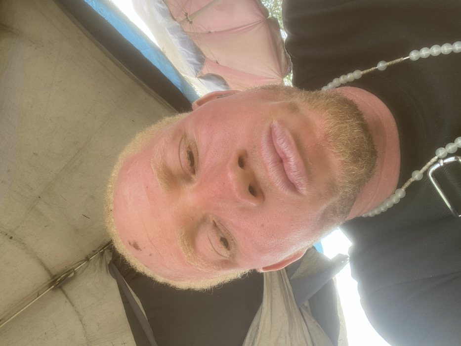 This image, captured in Onitsha, Nigeria, presents a close-up, low-angle view of a male individual with albinism. The subject has closely cropped light blonde hair, light eyebrows, and a light blonde beard. His facial skin is markedly reddened. A brown lesion is visible on his forehead, and a small dark mark is present on his right earlobe. His eyes are partially open and directed downwards, with full lips slightly pouted. He wears a black, crew-neck garment. A necklace of translucent, light-colored beads is visible around his neck, alongside a black strap, possibly from a bag. The immediate background shows the underside of a worn, light-colored canvas canopy. To the upper right, a section of a pink and white striped outdoor umbrella is visible, indicative of a market or street vendor setting. The scene is brightly illuminated.