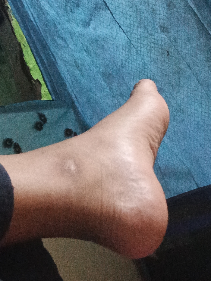 A bare human left foot is depicted, positioned diagonally with the heel towards the lower right and toes pointing towards the upper left. The foot exhibits a light brown skin tone. A distinct, raised, light-colored lesion or swelling is observed on the dorsal aspect of the foot, superior to the metatarsal area. The overall appearance of the foot suggests some general swelling or puffiness. A segment of dark fabric, consistent with clothing, is visible around the ankle at the bottom left. The background consists primarily of a textured blue fabric, possibly woven, covering the upper and right portions of the frame. To the mid-left, behind the foot, a dark surface with several small, dark, circular markings is present, partially obscured by a bright green object or surface in the upper-left background. No specific location within Bandung City, Indonesia, can be determined from the provided visual information.