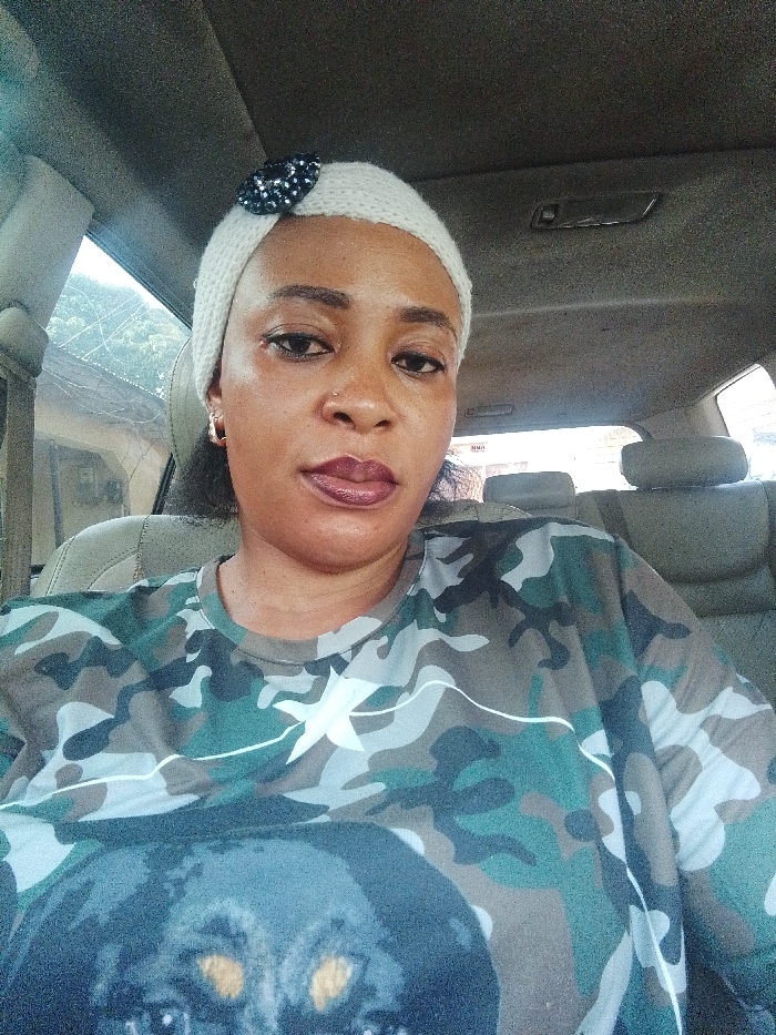 A woman sits in a car, wearing a white knitted headband with a sparkly black embellishment. She has hoop earrings and a nose ring. Her lips are painted with a dark shade of lipstick. She is wearing a camouflage patterned t-shirt. The background shows car seats and a window, hinting at being inside a vehicle.