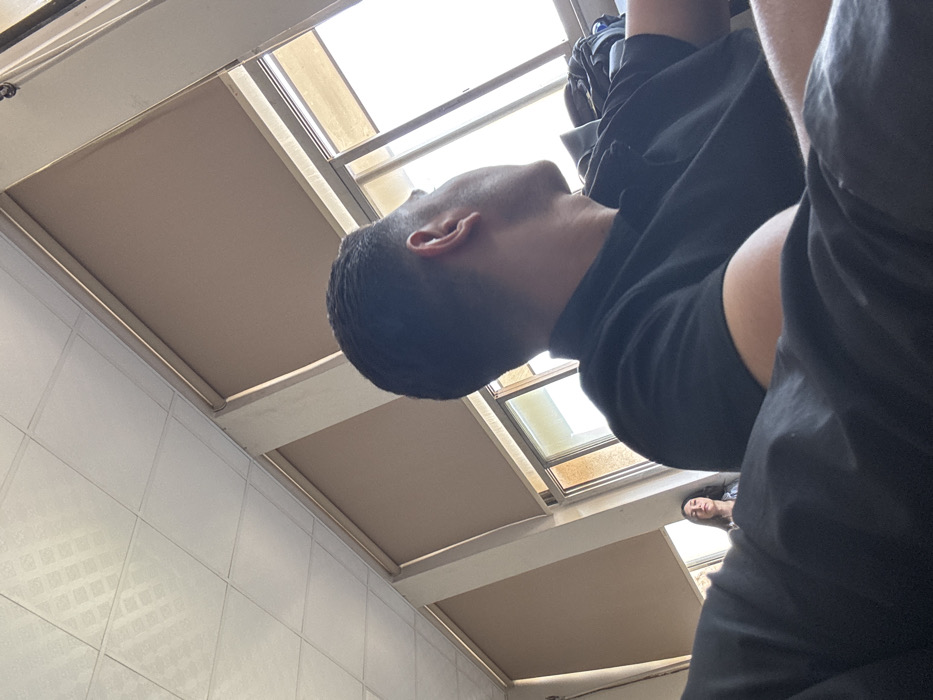 This image depicts an indoor setting within Rukn ad-Din Municipality, Syria. The scene is viewed from a low angle, showing a male individual in the mid-ground, seen from the back and right profile. He has short, dark hair and wears a black short-sleeved collared shirt. His right arm is bent at the elbow, and he appears to be looking towards the right side of the frame, past large windows. These windows are partially covered by light-brown roller blinds, allowing bright natural light into the room. A second individual, a female with dark hair and a light-colored top, is visible further in the background to the left of the male, looking generally forward. The ceiling consists of white square drop tiles, some featuring a subtle diamond pattern. The immediate foreground is a blurry dark area, suggestive of clothing.