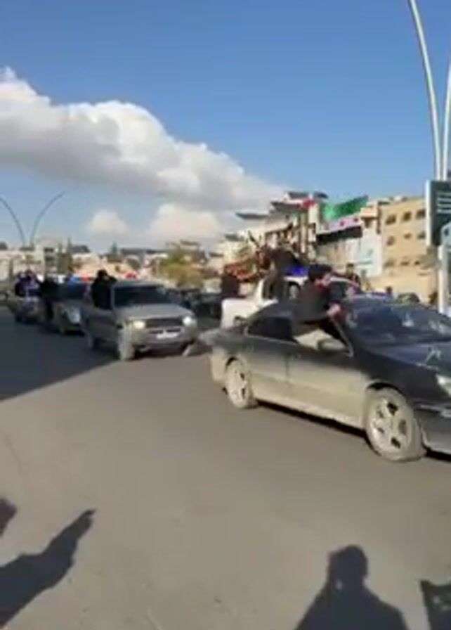 street scene with a procession of vehicles, including cars, pickup trucks, and a minivan, some with flashing lights. Several people are riding on the backs of the pickup trucks or standing in the open door of the minivan. Some vehicles are carrying flags. Several men are riding motorcycles in the street. The sky is blue with scattered clouds and the video appears to be taken during the daytime. Buildings are visible in the background.