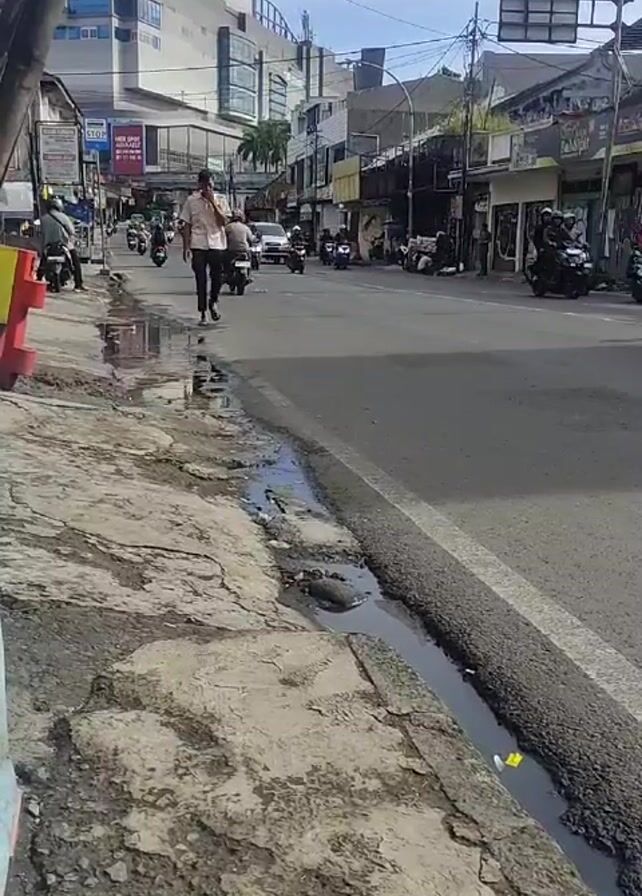 A street scene unfolds under a bright, overcast sky. The foreground is dominated by a cracked and uneven sidewalk, punctuated by puddles and a narrow drainage ditch filled with water. The road, divided by a white line, features a steady stream of motorcycle traffic and a single white car driving away from the camera. On the left side of the frame, construction barrels and parked motorcycles are visible. A man dressed in a short-sleeved shirt and dark pants walks across the street, holding a phone to his ear. Behind the road, buildings of varying heights form a backdrop, including what appears to be a multi-story commercial structure and smaller shops with awnings. Utility poles and wires stretch across the sky.