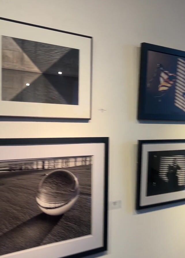 display of framed photographic artwork on a white wall. The camera initially shows a wall containing multiple framed prints. The frames are a combination of white and black. The art pieces appear to be black and white photographs. The camera pans up to a black and white abstract photo with light and shadow. Then, the camera focuses on a framed photograph of a clear ball on a patterned surface. The camera pans to a framed photo of two nude figures, intertwined in a seated position. The photo is in black and white, and the frame appears to be stained dark wood. The video ends there.