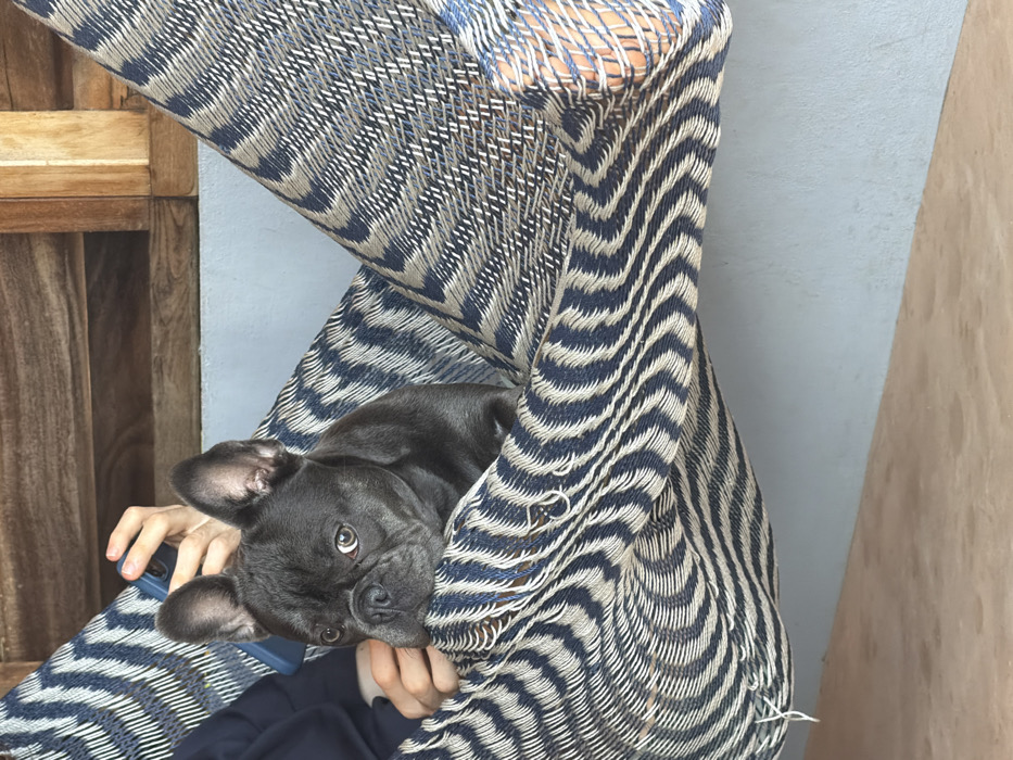 - "A gray French Bulldog nestled in a woven, zigzag-patterned wrap" by FM-4tJwl2, licensed under CC BY 4.0